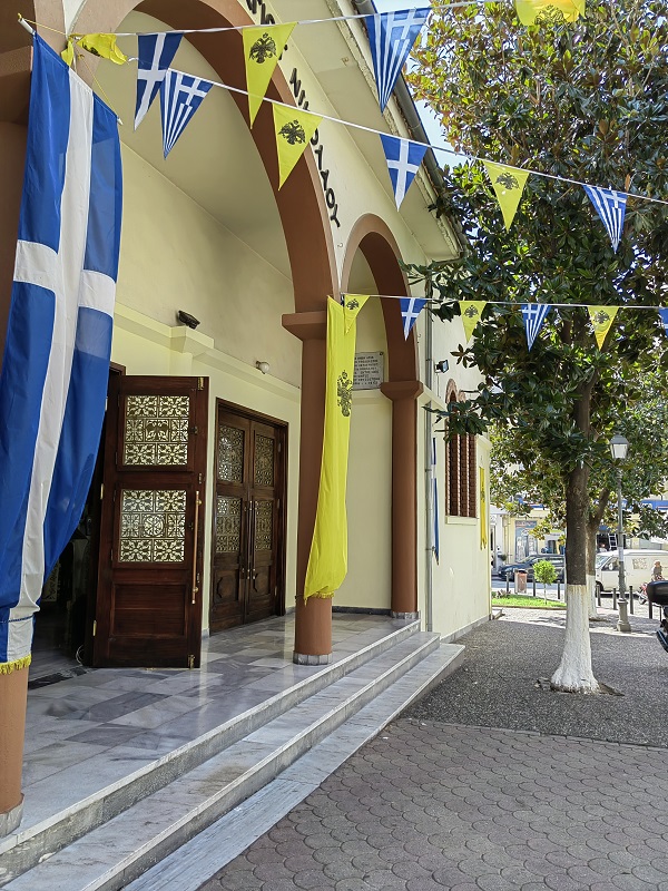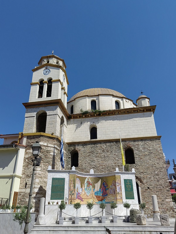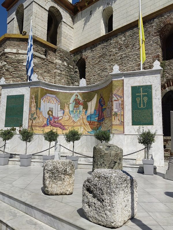 Έξω από τον Ιερό Ναό του Αγίου Νικολάου, δεσπόζει ένα εντυπωσιακό ψηφιδωτό 35 τετραγωνικών μέτρων, αφιερωμένο στα βήματα του Αποστόλου Παύλου, που περνώντας από την Αρχαία Εγνατία Οδό, επισκέφτηκε τους Φιλίππους (49/50 μ.Χ.), ιδρύοντας την πρώτη χριστιανική εκκλησία στην Ευρώπη και βαπτίζοντας την πρώτη γυναίκα στην Ευρώπη, με το όνομα Λυδία.