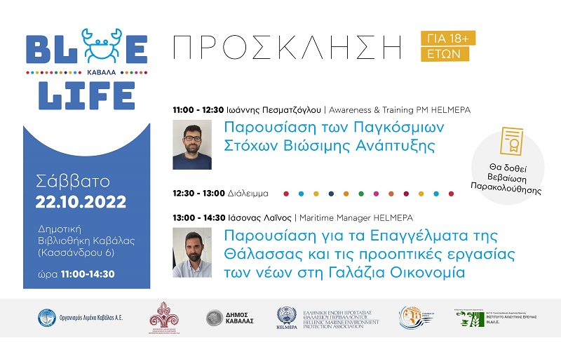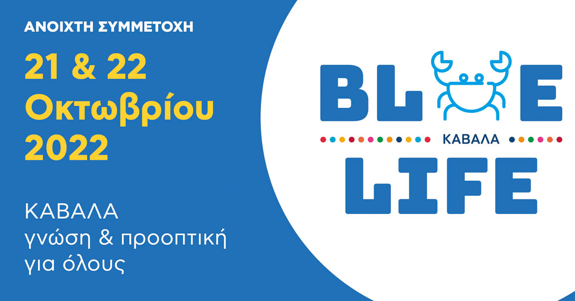 Ο θεσμός BLUE LIFE KAVALA θα διεξαχθεί στην πόλη της Καβάλας, την Παρασκευή 21 και το Σάββατο 22 Οκτωβρίου 2022. Μέσα από παρουσιάσεις και εργαστήρια, αναδεικνύεται ένα συμμετοχικό μοντέλο που προάγει το διαμοιρασμό και την ανταλλαγή γνώσης και καλών πρακτικών, και στοχεύει στην ευαισθητοποίηση, ενημέρωση και πληροφόρηση των συμμετεχόντων (ανάλογα τη δράση σε μαθητές/τριες, νέοι, εκπαιδευτικοί, γονείς και κηδεμόνες, επαγγελματίες της θάλασσας, ευρύτερο κοινό) και κυρίως κατανόηση των περιβαλλοντικών προκλήσεων καθώς και των ευκαιριών απασχόλησης και επαγγελματικής σταδιοδρομίας που προκύπτουν στον ταχύτατα αναπτυσσόμενο κλάδο της γαλάζιας οικονομίας.