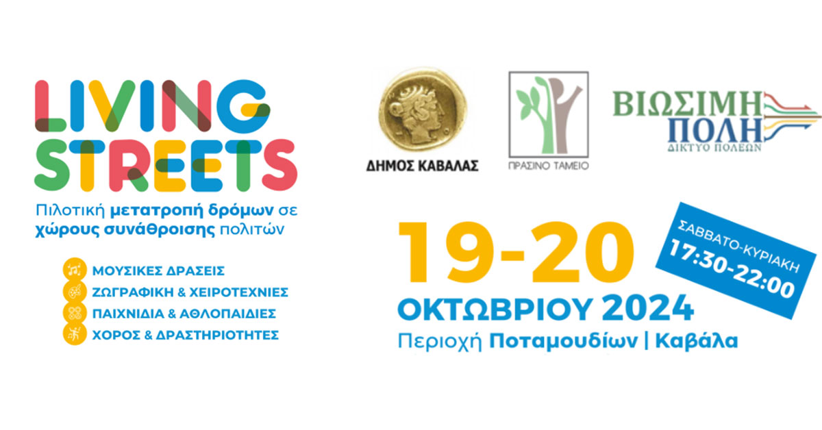 Ο Δήμος Καβάλας διοργανώνει ένα διήμερο εκδηλώσεων στο πλαίσιο του Προγράμματος «LIVING STREETS – Πιλοτική μετατροπή δρόμων σε χώρους συνάθροισης πολιτών» σε λίγες μέρες, το Σάββατο 19 και την Κυριακή 20 Οκτωβρίου, στην περιοχή των Ποταμουδίων.