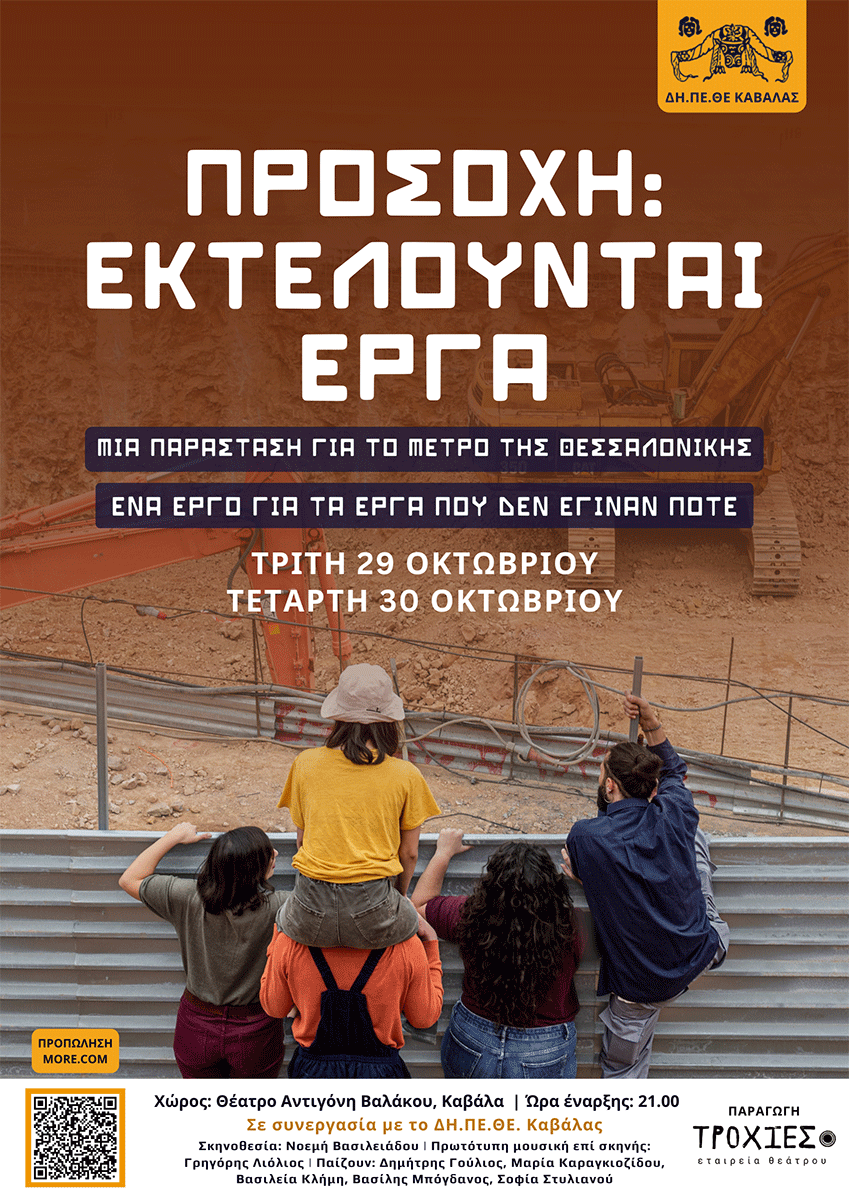 Στην παράσταση «ΠΡΟΣΟΧΗ: ΕΚΤΕΛΟΥΝΤΑΙ ΕΡΓΑ», σταθμοί της ιστορίας του μετρό, συνεντεύξεις εμπλεκόμενων μερών και επιτόπια έρευνα μπλέκονται με φανταστικές ιστορίες και προσωπικές σκέψεις, προκειμένου να μετατρέψουν την αναμονή για το έργο σε έναν εναλλακτικό κοινωνικό στοχασμό. Μια ομάδα νέων ηθοποιών, που δεν θυμάται πώς ήταν η πόλη της χωρίς εργοτάξια, ερευνά επί σκηνής το δίπολο στασιμότητα-μετακίνηση σε μια προσπάθεια να απαντήσει στο ερώτημα: Τι είδους μετακινήσεις ονειρεύονται οι νέοι άνθρωποι, όχι μόνο στους δρόμους αλλά και στη ζωή τους; Αγωνιζόμενη να αντισταθεί σε μια νομοτέλεια παραίτησης, η ομάδα δημιουργεί ένα έργο για το έργο. Ένα έργο που ψάχνει κι αυτό απεγνωσμένα την ολοκλήρωσή του.